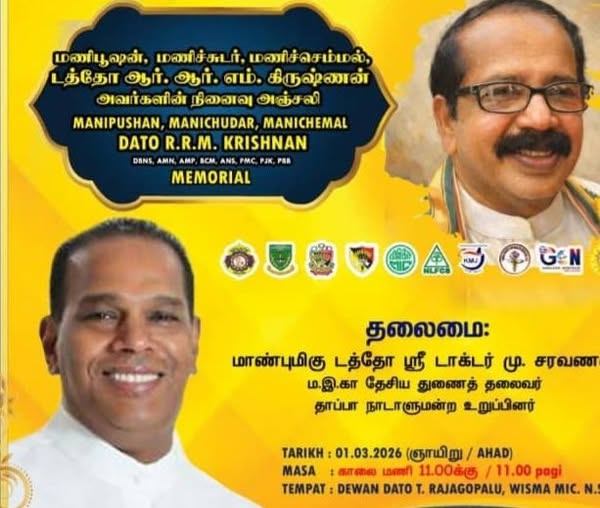 மலேசியத் தமிழ் இளைஞர் மணி மன்றங்களின் தேசியத் தலைவராகவும், மலேசியத் தமிழ் இளைஞர் மணிமன்ற முன்னால் உறுப்பினர்கள் பேரவையின் தேசியத் தலைவராகவும், மலேசியத் தமிழ்ப்பள்ளி முன்னால் மாணவர் சங்கங்களின் பேரவையின் தேசியத் தலைவராகவும், மஇகா சிரம்பான் தொகுதியின் நிரந்தர தலைவராகவும், மற்றும் பல பொதுநல இயக்கங்களிலும் பொறுப்பேற்று மிகச் சிறப்பாகப் பொதுப் பணியாற்றியவர் நினைவில் வாழும் மணிச்சுடர் டத்தோ ஆர்.ஆர்.எம். கிருஷ்ணன் அவர்களின் நினைவஞ்சலி வரும் மார்ச் 1, 2026 ( ஞாயிற்றுக்கிழமை ) காலை11.00 மணி தொடக்கம், டேவான் டத்தோ டி. ராஜகோபாலு, விஸ்மா MIC NS யில் நடைபெறவுள்ளது.