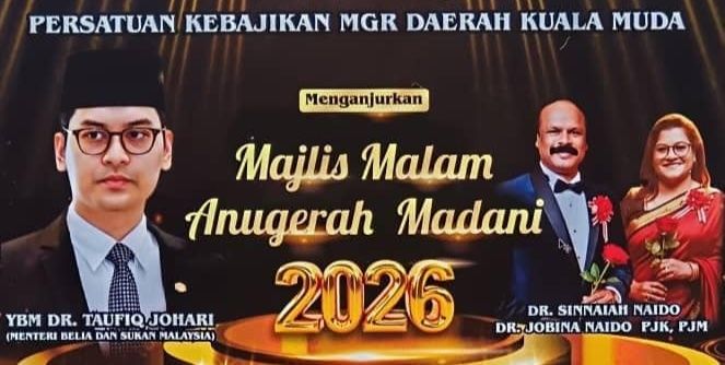 வரும் 04.04.2026 சனிக்கிழமை மாலை மணி 6.00 pm-11.00 pm மணி வரை Sungai petani JERAI hotel ballroom வடமாநில இந்தியர் கலைஞர் AVRM விருதளிப்பு கலைவிழா பிரமாண்டமான ஏற்பாட்டில் நடைபெறவுள்ளது,